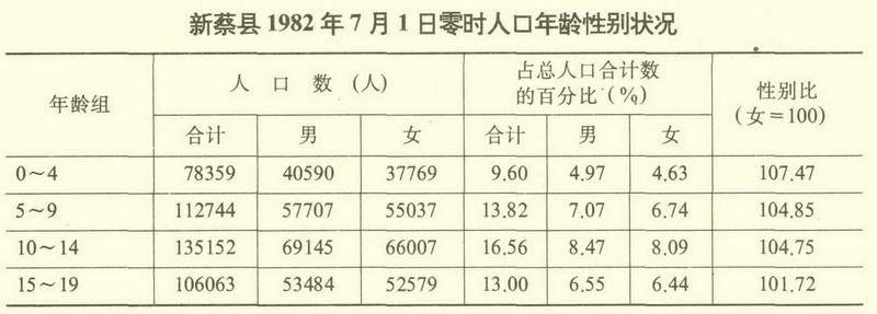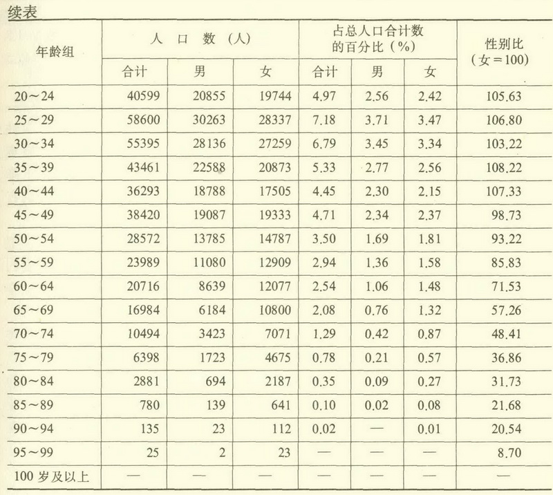 年龄构成 按照国际通用人口年龄类型标准,1964年7月人口普查时,全县O~14岁人口占总人口的39.77%,65岁及以上人口占总人口的2.6%,占0~14岁人口的6.54%;1982年人口普查时,上述指标分别为39.98%、5%和1 1.6%,均属于年轻型人口年龄类型。按桑德巴氏(Sand barg)人口再生产类型标准,1964年,全县15~49岁人口占总人口的48.98%,50岁及以上人口占11.24%;1982年上述指标分别为46.42%和13.6%,人口再生产类型属增加型。全县劳动力年龄人口(男16~59岁,女16~54岁),1982年为395627人,占总人口的48.48%,比1964年增加270698人,其中18~22岁人口占总人口的8.25%。