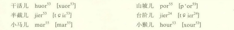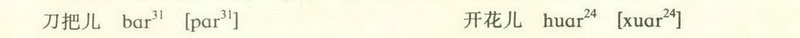 儿化 西平话儿化和普通话基本一致,也是在一个音节尾音上附加卷舌动作。所不同的是西平话儿化有的带闪音,有的声韵全变;本来没有舌尖后音的地区,儿化后舌尖后音也出现了。儿化时在音节后面加上r(表示一个卷舌动作)。儿化规律大致可分以下几类: