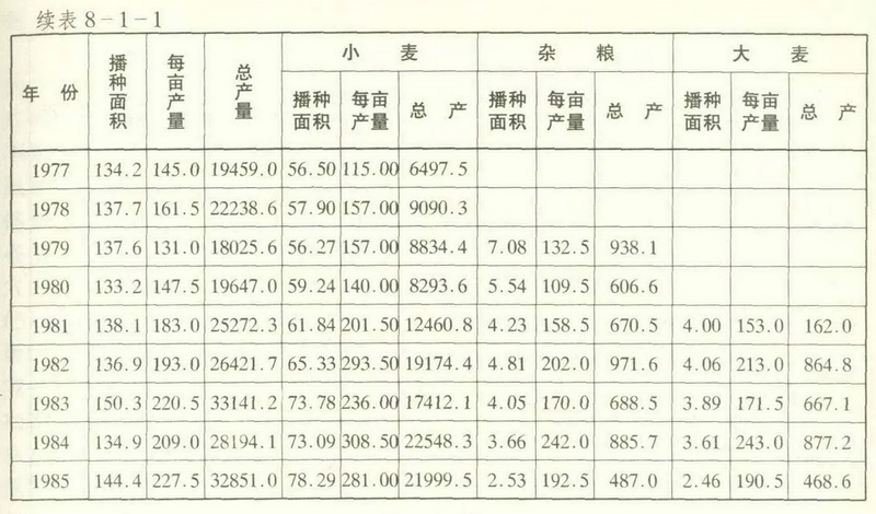 1.大麦、豌豆、扁豆。豌豆、扁豆常与大、小麦混播,纯播面积小。民国25年(1936年)种植大麦25.6万亩,亩产56公斤,总产1433.6万公斤。民国35年(1946年)种豌豆1.22万亩。1950年大麦面积15.08万亩,亩产52.76公斤,总产796.5万公斤;豌豆5.45万亩,单产47.5公斤,总产258.5万公斤;扁豆1.6万亩,亩产38公斤,总产61万公斤。1963年大麦面积10.9万亩,亩产51公斤,总产531.5万公斤;豌豆3.03亩,亩产51.25公斤;总产155.5万公斤;扁豆8.93万亩,亩产47.5公斤,总产42.5万公斤。70年代后,种植面积逐渐减少。1979年,夏杂粮(含大麦、豌豆、扁豆)种植面积7.08万亩,亩产132.5公斤,总产936.5万公斤。1982年,大麦种植4.06万亩,亩产213公斤,总产866万公斤;夏杂粮(含豌豆、扁豆)4.81万亩,亩产202公斤,总产972万公斤。1985年,大麦种植面积2.46万亩,亩产190.5公斤,总产471万公斤;夏杂粮(含豌豆、扁豆)2.53万亩,亩产192.5公斤,总产487.62万公斤。