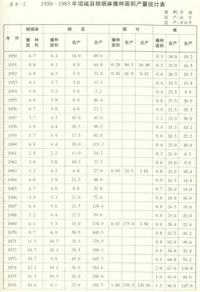 3.麻。(1)青麻、黄红麻。明清时已有种植,农户习惯种撒于田间地头、沟河坡洼、荒废地带或房前屋后。1950年种植3249亩(收获面积3217亩),单产34.2公斤(干麻),总产11万公斤。1957年种植1.18万亩(收获面积1.17万亩),单产25.35公斤,总产29.5万公斤。1950~1957年国家实行派购,鼓励种麻。60年代供销社收购麻并引进黄红麻。70年代黄红麻因产量高而面积增大,青麻面积相应减少,只占麻类播种面积的1()~15%。效益上一亩麻相当于1.5亩粮食,故种植面积增加。1974~1978年黄红麻种植在1万亩以上。1979年种植1.13万亩,平均亩产65公斤。1979年青麻面积1830亩。1980年4508亩。1985年扩大到5.8万亩,亩产90公斤,总产518.4万公斤,创历史最高纪录。1985年,仅剩749亩,单产76.5公斤。(2)其它麻。1980年引种宁麻、大麻(线麻)等,种植面积只有569亩,单产44公斤。1985年仅种114亩,亩产171公斤。