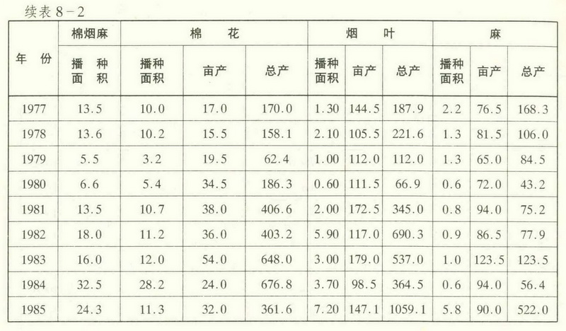 2.烟叶。民国2年(1913年),英美烟草公司在县内试种烤烟数亩。民国35年(1946年)栽种350亩,亩产75公斤。建国初有零星种植,1950年栽种41亩,单产61公斤。1951年栽种1657亩,单产84.5公斤。以后时种时息。1976年开始大面积种植,总面积达1万亩,亩产140公斤。老品种有柳叶青、罗丝头、高脚黄等。1979年种1.02万亩,单产112公斤,开始生产烤烟。1980年被定为生产烤烟重点县。1984年,被定为生产优质烤烟重点县。1985年,烟叶种植面积扩大到7.19万亩,亩产147.1公斤,烤烟总产1058.17万公斤。