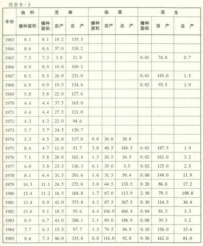 2.花生。清宣统三年(1911年)已有种植,时名落花生。民国36年(1946年)种植500亩。1950年种植373亩,单产40.2公斤。建国初期多与棉、瓜地套播。1959年种1514亩,单产99公斤。1960年后,时种时息。1979年种植1982亩,平均亩产86公斤。1980年种2.49万亩,单产79.5公斤,总产198万公斤。以后种植面积减少。1985年种5214亩,单产162公斤,总产84.54万公斤。