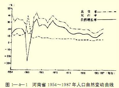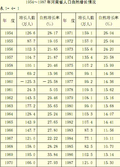 1954~1987年河南省人口的自然变动(出生减去死亡,不包括机械变动),分5个阶段: