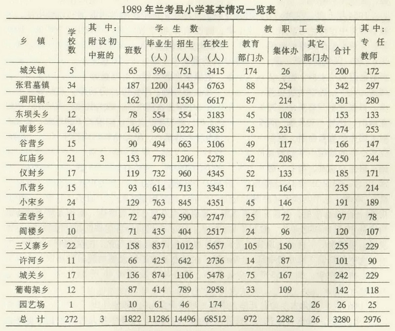 1989年全县进一步巩固扩大初等教育成果,教育质量明显上升。是年,全县有小学272所(其中回民小学3所)1822班,在校学生68512名。其中招新生14496名,毕业生11286名,教职工3280名。