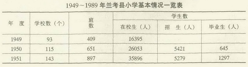 1948年10月,兰封、考城两县人民民主政府接管学校后,立即组织师生复课。为改变小学教师紧缺的状况,兰封、考城分别于1949年7月、1950年2月在县初级中学附设短师班,学生毕业后全部分配到小学任教。此后两县在“向工农开门”的办学方针指导下,大力动员贫苦农民子弟入学,小学教育迅速发展。到1952年,两县小学已达153所901个教学班,在校生36023人,教职工677人。1953年两县贯彻“整顿巩固,重点发展,提高质量,稳步前进”的方针,决定以发展初中为重点,对小学着重整顿提高,教师队伍得以充实,教师素质和教学质量明显提高。