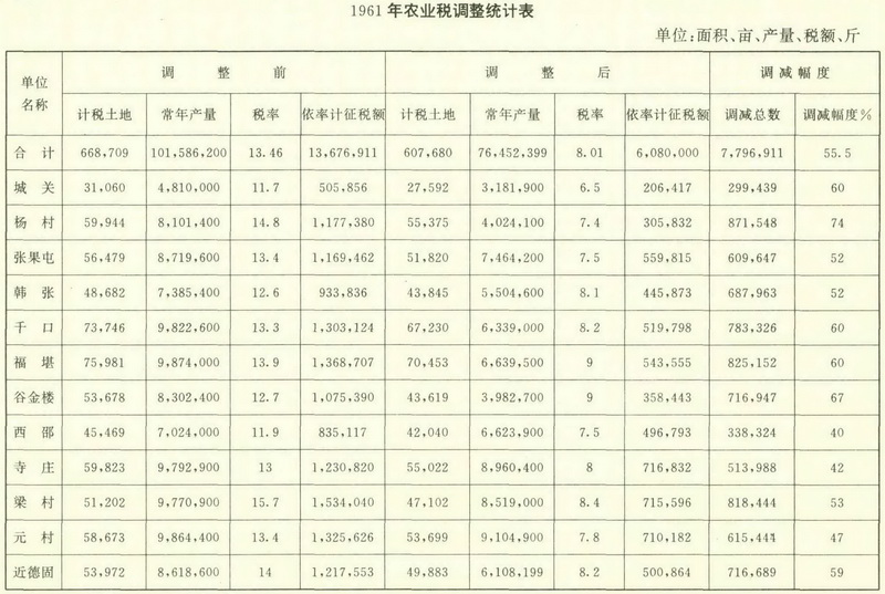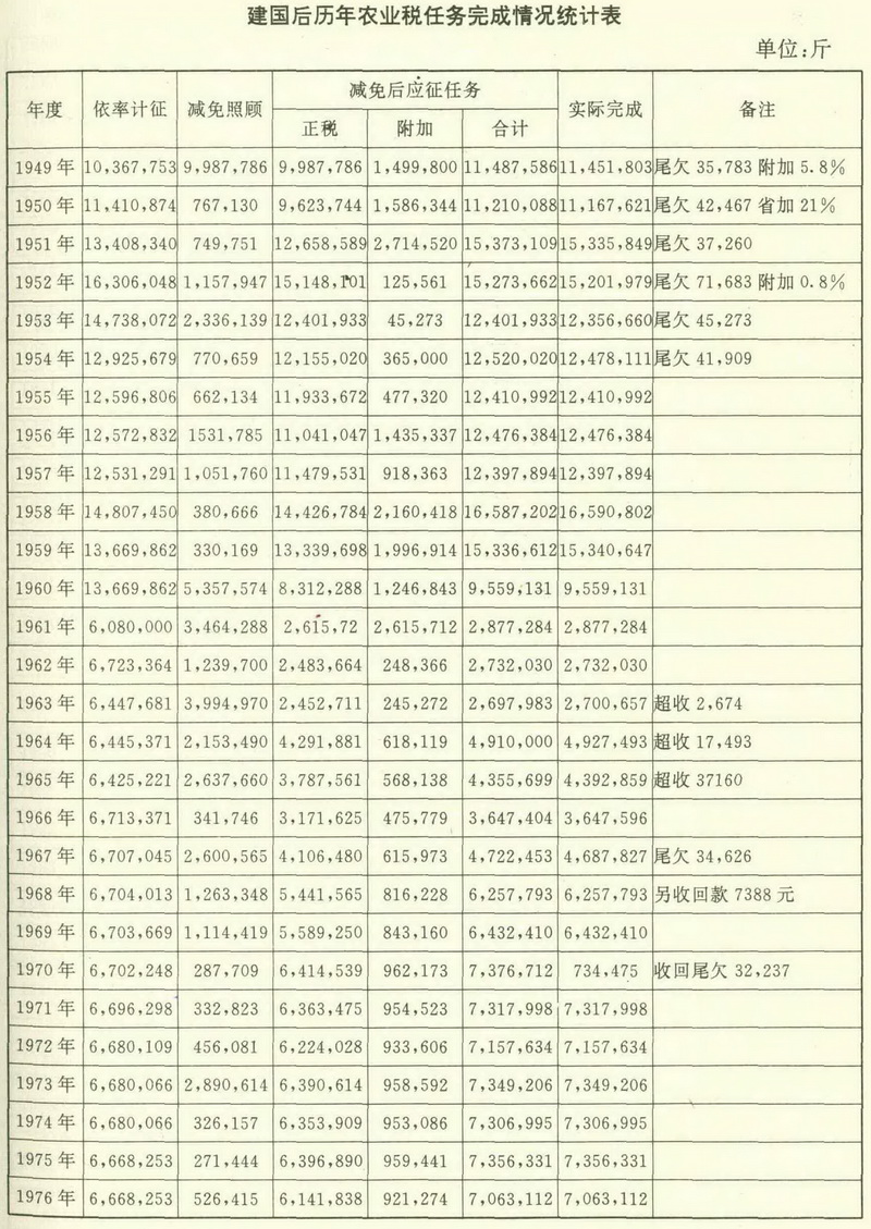 1959~1961年,由于遭受严重的自然灾害,加之浮夸风、瞎指挥等人为的因素,农业生产遭到严重破坏,人民生活降到建国以来最低水平。农业税征收困难。1960年全县农业税减免额为535754斤,占依率计征任务的39.2%。1961年,农业税下调55%,农业税率由原来的13.5%减为8%。1962年,根据中共中央"农村人民公社工作条例修改草案"的规定,对社员的自留地和开荒生产的农产品不算入集体分配的产量和集体分配的口粮以内,免征农业税。1963年,洪水为害,农田被淹,全县绝大部分生产队减免农业税。1964年,国务院发出《关于增加农业附加税解决农村社会主义教育经费的通知》,农业税附加由原来的10%改为15%。其中,上解省4%,地区3%,县留5%,公社留3%。"文化大革命"中,农业税收仍以生产队为单位,以产量高低为依据计征。