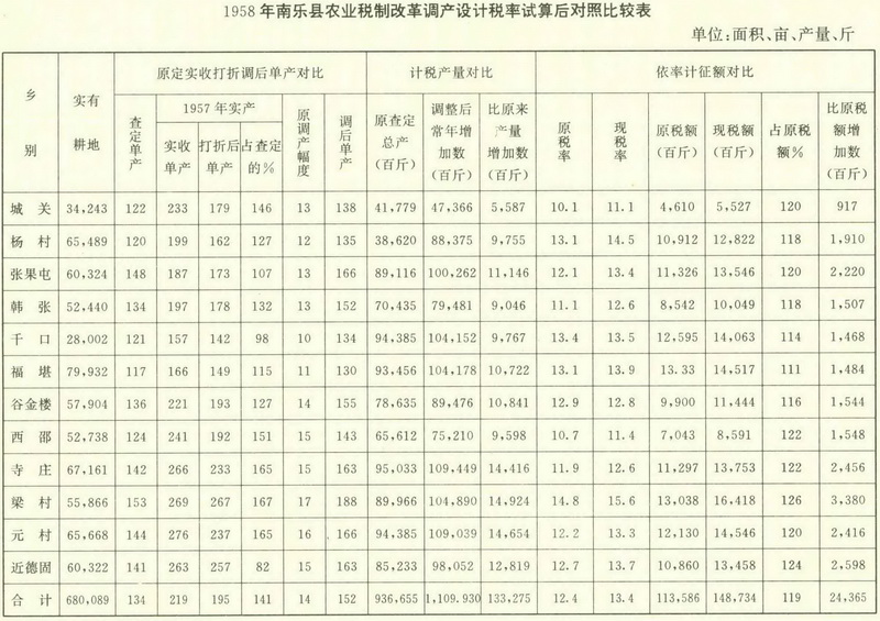 1950年春天,县、区成立丈量土地委员会,并抽出大批干部进行这一工作,澄清了土地数,填发了土地证,保证了地权,使全县农业税征制度更加完善。1951年,农业税的交纳,按照核定的田亩产量与国家税率负担,并根据受灾程度,切实以法减免。做到"应征必征,应减必减,应免必免。"县行税率是:每负担亩,全年20斤小米。灾歉减免标准是:歉收二成以上,分别减免20%到全部减免不等;歉收二成以下者,不予减免。1952年,根据政务院《关于1952年农业税收工作的指示》,贯彻执行"种多少田,应产多少粮食,依率计征,依法减免,增产不增税"的农业税负担政策。县、区、村逐级成立查田委员会,共查出黑田4万亩。根据全县土质不同分为6类。按土质优劣,产量高低分为10等。最高亩产粮食定为2.03石,最低为0.5石。1956年,全县实现农业合作化,农业经济结构发生了重大变化,原来的农业税征收办法已和农业形势的发展不相适应。因此,农业税征收作了相应调整。对合作社采取以社为单位,先征后购的办法。1958年,农业税的征收由累进税制改为对农业合作社征收不同税率的比例税制。新的税制执行后,南乐农业税率由原来的12.81%上升为13.4%,低于全国税率(15.5%)和河南省税率(15%)。当时,农业税虽有提高,由于农业收入的增长,并未加重农民的负担。