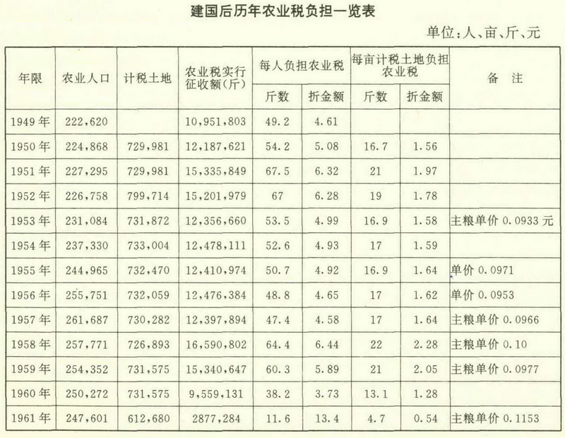 1948年12月25日,华北人民政府颁发"华北区农业税暂行税则。"是时,全县已进行了土地改革,农村的土地制度和经济状况起了重大变化。新税制征税原则:(一)将耕地定"标准亩",凡常年产量(以谷为准)达10市斗的土地,每市亩作为一个"标准亩",超过或不足10市斗者,每市斗按"标准亩"的1分土地计算。同等土地因勤劳耕作,收获量超过应产量者,超过部分不多计征;收获量不足应产量者,不足部分也不少征。(二)所有农业人口,不分男女老幼,均扣除1个"标准亩"的免征点免交农业税。鳏、寡、孤、独、无劳动力,家庭贫困,生活艰难者及革命军人、残废军人、革命职员家属、烈士家属生活困难者,申请县政府批准后,免征点还可提高。(三)革命军人、职员及烈属,均在本人家中扣除1个标准亩的免征点。(四)牛、驴每头扣除一个标准亩十分之四;骡、马每头扣除标准亩的十分之七。(五)除去各项扣除外,余者定为"负担亩"。每1负担亩每年征细粮22斤(夏以小麦,秋以小米),地方附加5斤,分夏、秋两季征收。夏季预征,秋季统算,多退少补。无夏粮作物地区,秋季一次征收。(六)各农户诸项详实数字(指折算标准亩、人、畜扣除数及负担亩),经村农业税调查评议委员会调查评议后定案。(七)计算方法:1标准亩=1市石谷(10市斗);总标准亩=自然亩×每亩常年产量÷10市斗谷,负担亩=总标准-应扣免征点-牲口消耗;应交纳细粮=负担亩×27市斤。此税则具有发展生产,保障供给,公平合理,负担固定,明白好算五大优点,实施后深受人民的拥护。