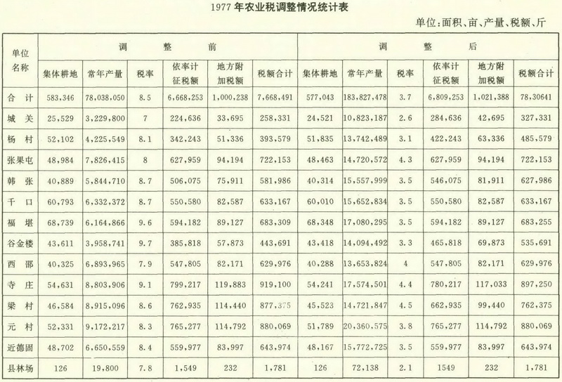 1977年,为进一步落实"合理负担,藏粮于民"的政策,根据社队之间税收负担出现畸轻畸重的现象,农业税进行调整。全县调增调减的生产队占51.1%;调增调减税额的幅度为10%。调整后,农业税计税土地由1976年的629231亩减为577043亩;税率由1976年的8.5%降为3.7%。依率计征有所上升。1979年始,对贫困队实行农业税起征点减免政策。起征点标准:以生产队为计算单位,全年每人平均口粮300斤以下和收入分配金额(不包括工业收入,下同)45元以下的生产队为农业税免征队;全年每人平均超过上述其中一项者为农业税减征队。农业税起征点的计算:口粮以1976年至1978年3年平均的集体粮食总产量,扣除种子、饲料和生产粮,下余部分按人口平均分配,即为农业税起征点的口粮标准。