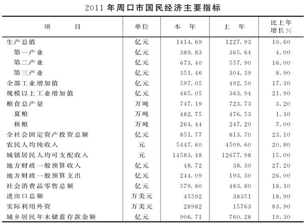 2011年,全市实现生产总值1414.69亿元,比上年增长10.6%。其中,第一产业增加值389.83亿元,增长4%;第二产业增加值673.4亿元,增长16%;第三产业增加值351.46亿元,增长8.9%。人均生产总值15813.7元。全部工业增加值597.05亿元,增长17.3%。粮食总产量747.19万吨,增长3.2%。财政一般预算收入48.72亿元,一般预算支出244.09亿元。全社会固定资产投资完成额851.77亿元,增长23.1%。社会消费品零售总额579.8亿元。商品出口总额2.59亿美元。实际利用外资2.9亿美元。城镇居民人均可支配收入14583.48元,人均消费性支出10930.21元;农村居民人均纯收入5447.6元,人均生活费支出3713元。城乡居民年末储蓄存款余额906.71亿元。