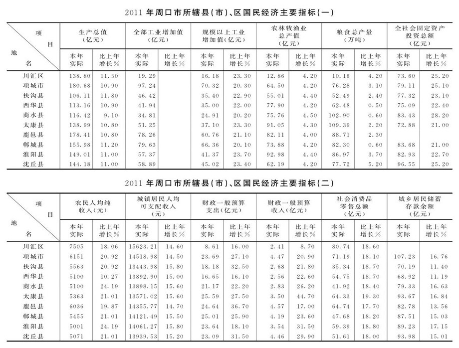 【概况】 周口市位于河南省东南部,是典型的平原农业大市,土地面积1.19万平方公里,其中耕地面积83.4万公顷;总人口1120.6万人,其中乡村人口767.6万人。人口自然增长率为4.59‰。辖川汇区,项城市,扶沟、西华、商水、太康、鹿邑、郸城、淮阳、沈丘8个县。