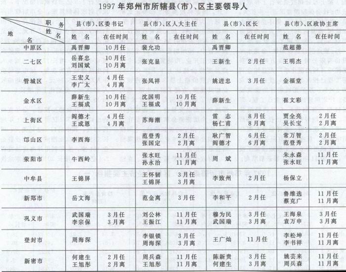 市长:陈义初(3月任职);副市长:张立兴(4月任职)、王治业、刘振中、康定军、周建秋、郑林山、房健