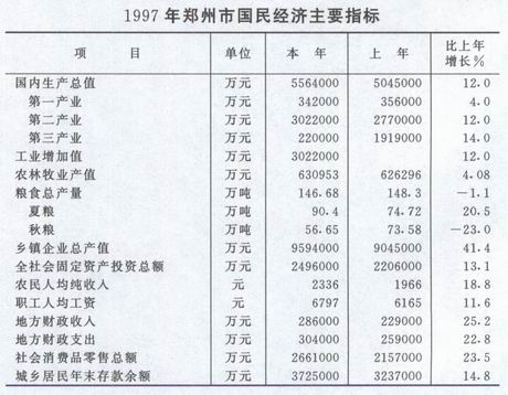 【概况】 郑州市是河南省省会,位于中原腹地。总面积7446.2平方公里,其中耕地面积300.61千公顷,市区面积1013.3平方公里。全市年末总人口614.8万人,其中农业人口416.86万人,市区人口213.43万人。人口出生率11.7‰,死亡率4.96‰,自然增长率6.81‰。辖金水、中原、二七、管城(回族)、邙山、上街6区,巩义、荥阳、登封、新密、新郑5市及中牟县,共有119个乡镇和35个街道办事处。