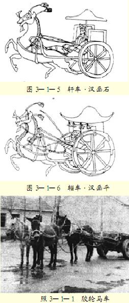 汉代马车种类增多,使用范围扩大了。皇帝、大臣和贵族出行时,都要有一个马车队跟随。汉代皇帝出行有大驾、法驾、小驾的区别,大驾出行跟随的马车多达81辆。一个县令的车队,也要有7辆马车组成,车队马车的多少,显示官职级别的高低。唐河县电厂出土汉墓中,密县打虎亭汉墓中都发现有马车队出行图。皇帝乘坐的车叫金根车、驾6马;高级官员乘坐的车叫轩车,车篷两侧有帷子;一般官员乘坐的车叫轺图3—1—5 轩车·汉画石车,上面伞盖,四面敞露;贵族妇女乘坐的车叫辎车,车蓬象一间小房屋。还有一种马车,车身与牛车相似,名为輂车,在马车中等级最低。