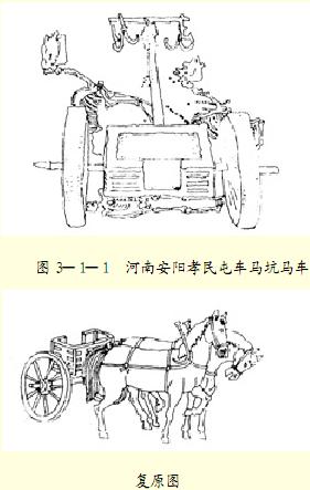 先秦马车的基本结构是单轴双复原图轮,轴上置车箱,从箱下引出单辕或双辕。辕头有一横木叫衡,衡中有轭驾一马,也有衡两端置双轭或四轭,用以驾双马或四马。安阳孝民屯出土的商代车,三门峡上村岭出土的春秋车,辉县琉璃阁出土的战国车,都是一车两马。《古今图书集成》考工典载:“天子驾六马,大夫以上驾四马”,这种车限于王候公卿乘坐。