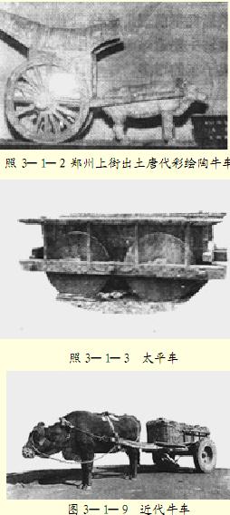 宋代的大车称太平车,《邵氏见闻录》载:“今之民间锱车,重大椎朴,以牛挽之,日不能行三十里,少蒙雨雪,则硅步不进,故谓之太平车”。豫东平原农村普遍使用的“太平车”即由宋代传来,4轮无辕,轮是木质实心,车箱成长方形,轮与箱齐高,箱内乘人或载货,以绳索并套2~4牛,多时可套5~7牛,日行20~30公里。
