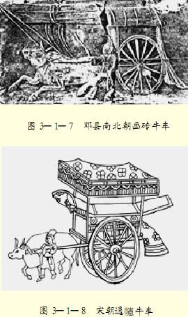 (二)牛车 古称大车。传说由商汤七世祖王亥发明,当时牛车仅用来运载笨重物品。汉武帝时兴起乘牛车,装饰也华丽起来。东汉以后贵族普遍使用。牛车分3种:“通幰牛车”,车顶从前到后幛一张大幔子; “偏 牛车”,幔子只遮住车的前半部;“敞篷牛车”,没有幔子。唐代继续服用牛车,但车子结构已有变化。至宋代时还有华丽的通幰牛车。因兴起坐轿,牛车结构逐渐转向载货。