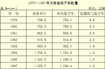 (三)简易汽车 又称柴油机动车,是民间运输工具技术革新成果。1968年河南省成立了柴油机动车技术研究小组,开始生产不定型,先是3轮,后改为4轮,都是用柴油机为动力,装上方向机、驾驶室和车厢而成,载重1~2吨。1973年省机动车选型会上,对各地试制的6轮2吨车和6轮2吨油压自卸车、半拖挂车、长材车,通过试车鉴定,一致肯定了6轮2吨车和6轮2吨油压自卸车为全省定型车。这两种车的优点是:机动灵活,适应短途运输,结构合理,坚固耐用,部件通用,便于维修。缺点是动力小,配件质量差,驾驶室不够舒适,而且污染重,噪音大,效率低。但在城镇短途运输中,效力比人畜力车高。1975年生产了3908辆,1980年发展到6590辆,1987年达6734辆。