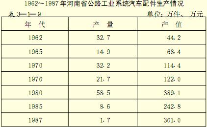 (三)配件生产 中华人民共和国成立初期,因拼修国民政府遗留的破旧汽车,郑州汽车修配厂自制了汽缸缸套、活塞环、气门等12种配件,解决了缺少配件的困难。当时省营汽车配件供应十分困难。1961年,国家为解决配件不足的困难,决定由省交通厅统一安排生产和供销,成立河南省汽车配件公司。当年全省汽车配件生产达56.1万件(组),产值229.7万元,比1960年分别增加74.2%和91.4%。1963年7月国务院决定汽车配件生产统一归机械口安排,省汽车配件公司交机械厅经营,为解决专业汽车运输的需要,在交通工业系统内部继续安排一部分配件生产。1964年改制专用设备48台,工卡具620件,建立了产品检验和定额管理制度,提高了配件质量。1978年后,随着汽车迅猛发展,汽车配件大幅度增加。1980年公路工业系统生产配件58.5万件,产值389.1万元。1985年因省汽车运输公司撤消,企业下放,社会修理业的增多,公路工业系统配件生产有所减少。1987年产量只有1.7万件,产值361万元。