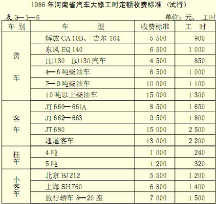 汽车大修占用车日、工时与费用历年不同,以交通部门10个专业汽车修配厂为例,大修平均在厂车日:货车最多96天,最少13天;客车最多117天,最少186天;其它平均工时与费用相同。