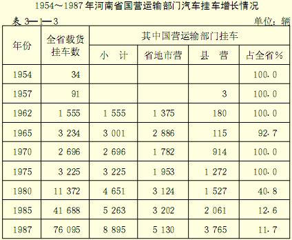 1964年交通部颁发了双轴挂车技术资料,挂车质量逐步提高。1976年河南省为支援生产救灾,统一设计生产挂车800辆。1977年省交通厅确定周口汽车配件厂为挂车生产专业厂,1984年共制造挂车2052辆。1985年全省载货汽车挂车已达41688辆,比1978年增加8.9倍。专业运输部门挂车20574辆(其中国营5263辆,集体3115辆,个体12196辆),机关团体、企事业单位21114辆。1987年全省民用汽车挂车已达76095辆。