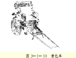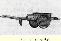 (三)架子车 又称板车、排子车、平车。结构简单,初为铁轮箍外包胶皮,中间为铁轴套,轴套和轮箍间用钢幅条支撑,轮较大,两轮间以铁轴相连,上置木板装货,伸出两把,用以推拉车。40年代逐步将铁轮改为充气胶轮,轮盘改小,载重量加大。中华人民共和国成立初期,架子车已成为城镇的主要运输工具。1958年因其使用方便灵活,造价低廉,各地普遍发展。至80年代,全省架子车已达1000多万辆,河南有“架子车王国”之称。