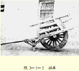 (一)独轮车 东汉时的鹿车是独轮车之始,因构造简单,使用方便,历代相传沿用。至清末式样增多,名称不一。有小车、土车、拱车之别。只有一轮,一人推行,可载货也可坐人。拱车(豫南称二把手)略有不同,车上起一脊,脊下装轮,脊两旁坐人或载货,较一般独轮车稍大,一人推一人拉,可载150公斤。后来独轮车逐步改为充气轮胎,装上轴承,更为灵活轻便,在建设工地、农村曾广泛使用。60年代架子车发展起来后独轮车渐少。