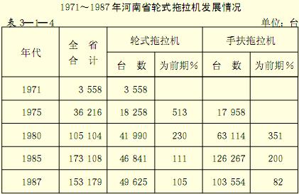 (五)拖拉机 1972年11月,省交通局、公安局、农林局联合通知,轮式拖拉机准许经营公路运输。1979年以后,全省拖拉机发展迅速。1984年国务院决定个人或联户的机动车和拖拉机准许经营公路运输,全省拖拉机有了大的发展,1987年已有各类运输用拖拉机153179台,其中小型拖拉机49625台,手扶拖拉机103554台,分别为1978年的186.8%、172.6%和194.6%。私人拖拉机139354台,占90.9%。
