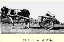 (三)毛驴车 即架子车套上毛驴,50年代后期开始广泛使用。因其轻便,适合搬运零星物资,方便山区短途运输,最大优点是借助牲口的力量能爬坡,效率比人拉高,豫北浅山区使用这种车子较多。