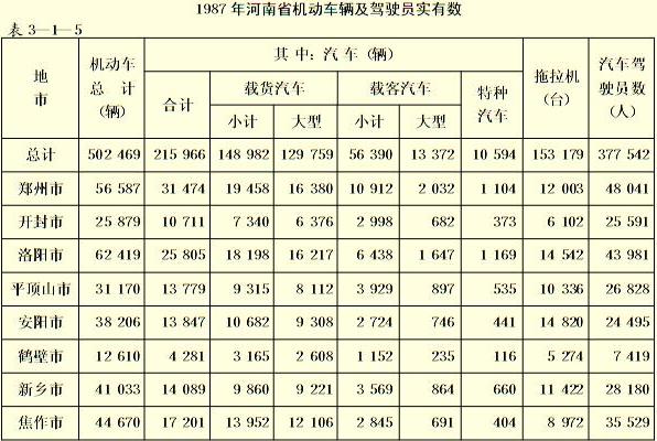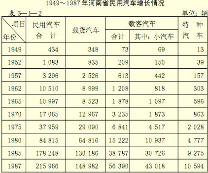1987年全省民用汽车共215966辆,比1978年增长24倍;其中载货汽车148982辆,增长2倍;载客汽车56390辆,增长44倍;特种汽车10594辆,增长51倍。交通运输部门客货汽车17793辆,增长14倍。私营客货汽车37187辆,其中货车30806辆,客车6381辆。