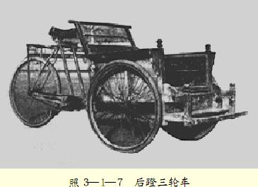 (四)三轮车 在黄包车与自行车的基础上改制而成,前面和自行车一样,后两轮上装车座,三轮成品字形。改人拉为脚踏,较黄包车省力,速度快,人们乐意乘坐,是城市主要客运工具。另有一种后蹬三轮车,置车箱于前,人在后蹬。此车由商丘县黄包车工人李世伦,于1938年根据上海铁质平斗三轮推菜车改制而成。以后发展起来,遍及豫东各城镇。70年代初大都改为机动三轮车,80年代逐渐减少。
