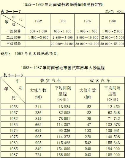 由于道路条件和汽车结构性能的改善,保养间隔里程相应的延长。1980年一保间隔里程比1952年延长1~2倍,二保延长4~7倍。省汽车运输公司所属企业,1982年一级保养平均间隔里程2258公里,为定额的162.8%;二级保养为13540公里,为定额的104.15%;三级保养为62729公里,为定额的139.39%。