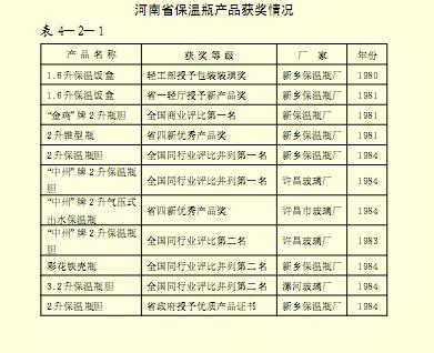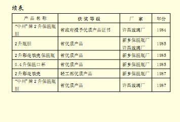 进入80年代后,该厂先后投资1000万元进行了二期大的技术改造,形成了2盘玻璃熔炉、7台吹泡机、8台拉底车、5条成装线的自动化生产规模,品种由单一的2升保温瓶发展到0.4~2升10多个系列品种。产品获1个部优、4个省优,主要经济技术指标跨入全国同行业先进水平,成为中原地区最大的保温容器生产及出口企业、省二级企业、轻工业部定点生产及出口保温容器的厂家。